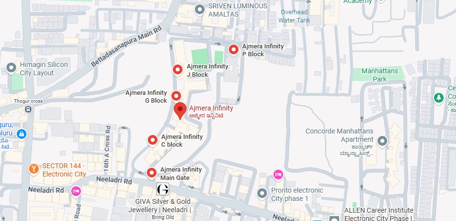 Ajmera Infinity enjoys a prime location in Electronic City Phase I, Bengaluru, making it highly suitable for professionals working in the city’s major IT corridor. The project offers excellent connectivity through Hosur Road and the Electronic City Flyover, enabling smooth access to key areas such as Silk Board, Koramangala, BTM Layout, and HSR Layout. Its proximity to leading IT companies like Infosys, Wipro, TCS, and Tech Mahindra significantly reduces daily commute time. The area is well supported by established social infrastructure, including reputed schools, colleges, hospitals like Narayana Health City, and various shopping and entertainment options. With improving public transport and metro connectivity, Ajmera Infinity provides a well-connected and convenient residential environment.