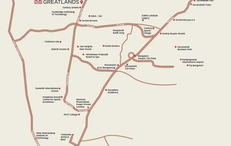Arvind Greatlands enjoys a prime location in Devanahalli, offering excellent connectivity to Kempegowda International Airport and smooth access to major roads leading toward Hebbal and central Bengaluru. The area is surrounded by fast-growing infrastructure, upcoming business zones, industrial parks, and SEZ developments, making everyday commuting convenient for professionals. Residents also benefit from nearby schools, colleges, and essential social facilities, creating a comfortable living environment. With North Bengaluru emerging as a major growth corridor, the project’s location carries strong long-term potential and increasing property value.