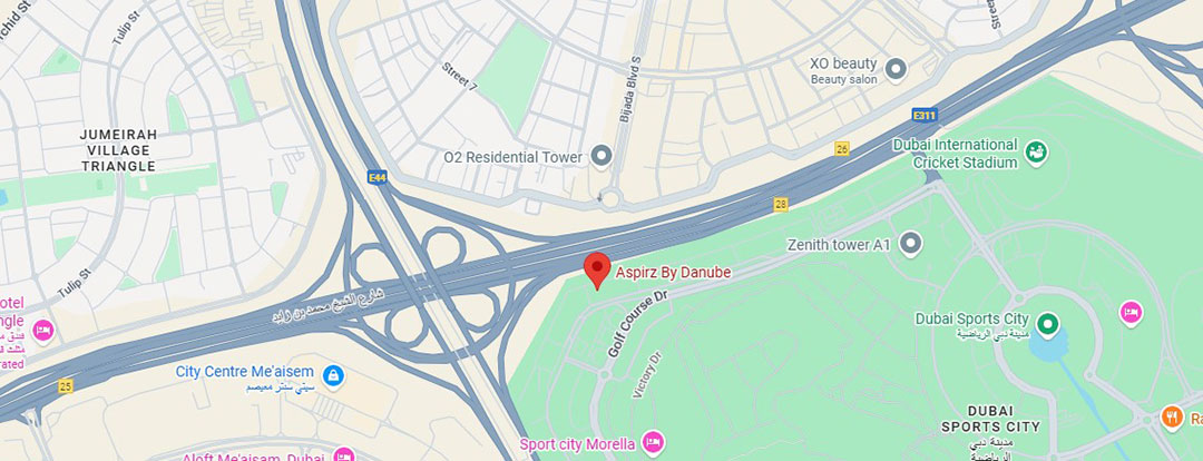 Aspirz by Danube is strategically located in Dubai Sports City, a prominent mixed-use community in Dubai known for its sports-centric and residential developments. The project offers excellent connectivity to major roads and highways, making it easy to reach key destinations such as Dubai Marina, Mall of the Emirates, and Downtown Dubai within 15–20 minutes.
