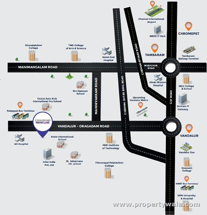 Casagrand Promenade is strategically located to offer excellent connectivity and convenience. It is well-linked to major roads, highways, and public transport, ensuring smooth commuting. The project is close to IT and business hubs, providing easy access for working professionals, and is near reputed schools, colleges, and healthcare facilities. Residents also have shopping centers, restaurants, and entertainment options within easy reach. Surrounded by a green and peaceful environment, Casagrand Promenade offers a serene lifestyle while being situated in a developing area with strong potential for property value appreciation.