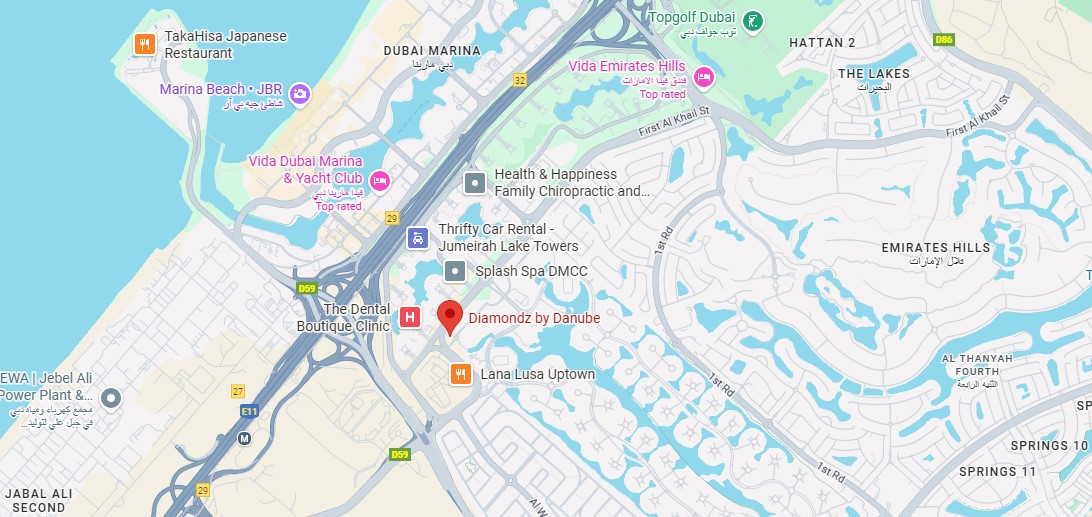 Diamondz by Danube is situated in the vibrant Jumeirah Lake Towers (JLT) community, offering excellent connectivity to major roads such as Sheikh Zayed Road and Al Khail Road. The location provides easy access to key business districts, shopping malls, dining, and entertainment hubs, as well as nearby metro stations for convenient public transport. Surrounded by landscaped lakes and parks, the project combines the energy of city living with a calm and community-focused environment, making it an attractive choice for both residents and investors.