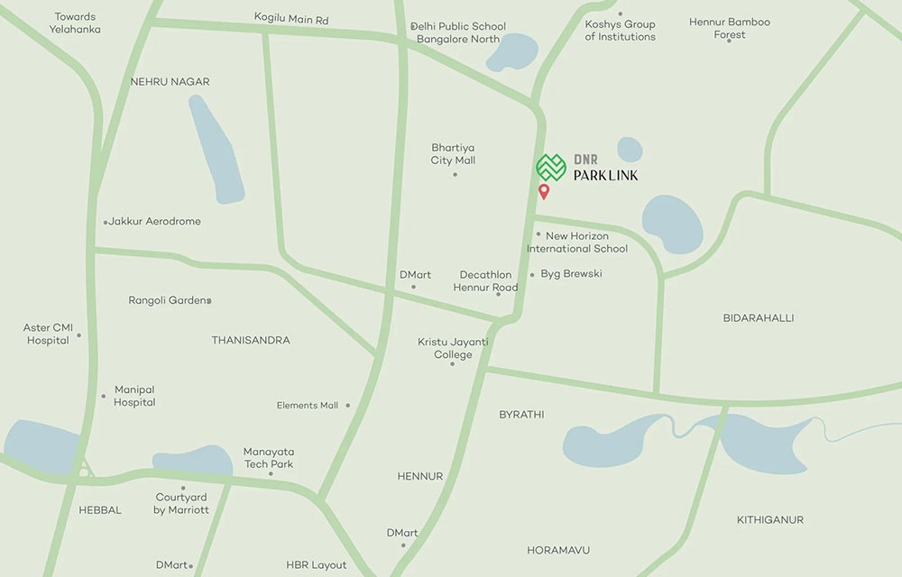 DNR Parklink Phase 2 is strategically located on Hennur Main Road, North Bengaluru, offering excellent connectivity to key areas such as Hebbal, Manyata Tech Park, and the Outer Ring Road (ORR). The neighborhood provides easy access to reputed schools, hospitals, shopping centers, and entertainment options, ensuring residents have all essential facilities nearby. With its proximity to major employment hubs and ongoing infrastructure development in North Bengaluru, the location combines convenience, accessibility, and growth potential, making it an attractive choice for families and professionals.
