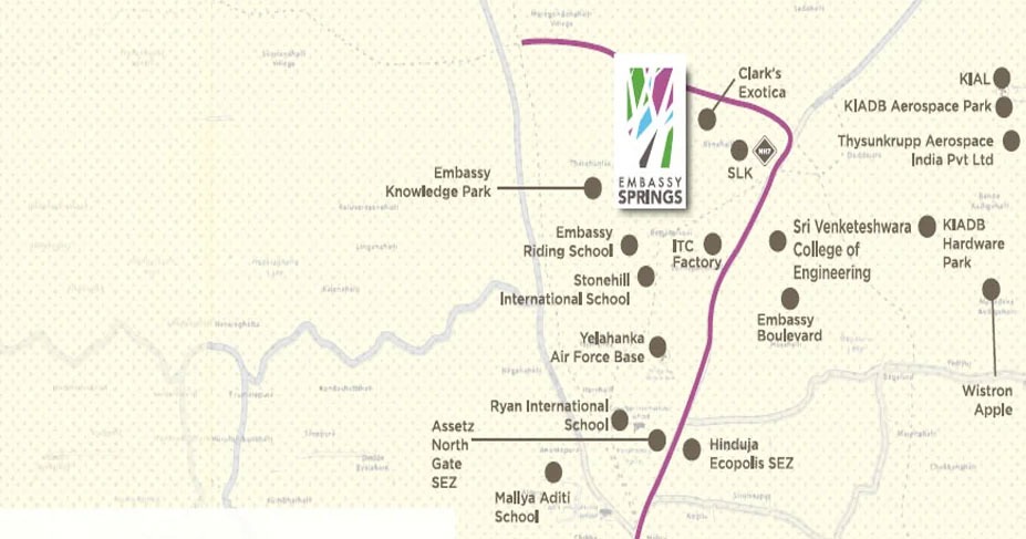 Embassy Verde is strategically located in Devanahalli, North Bengaluru, offering excellent connectivity to the Kempegowda International Airport and major highways. The area is part of a rapidly developing region with easy access to upcoming business hubs, IT parks, schools, hospitals, and retail and entertainment centers. Being within the Embassy Springs township, residents also benefit from well-planned infrastructure, wide roads, and green open spaces, making it a convenient and serene location for both families and professionals.