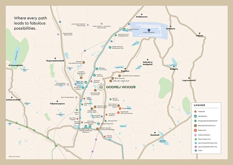 Godrej Woods (Bangalore) enjoys strong location advantages due to its position in North Bangalore (Thanisandra belt), one of the city’s fastest-growing residential and commercial corridors. The project offers excellent connectivity to Manyata Tech Park, Hebbal, ORR, and key IT hubs, making it ideal for working professionals. It is well linked to Kempegowda International Airport via major arterial roads, ensuring convenient travel.