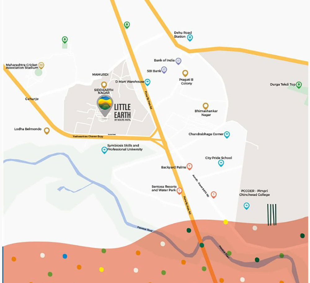 Kolte Patil Little Earth is located in Kiwale, a rapidly developing suburb in western Pune, offering a perfect balance of connectivity and serene living. The area provides easy access to major IT hubs like Hinjewadi, Wakad, and Baner, making it ideal for working professionals. It is well connected by the Pune–Mumbai Expressway and Mumbai–Pune Highway, as well as arterial roads linking Kiwale to central Pune and nearby suburbs.