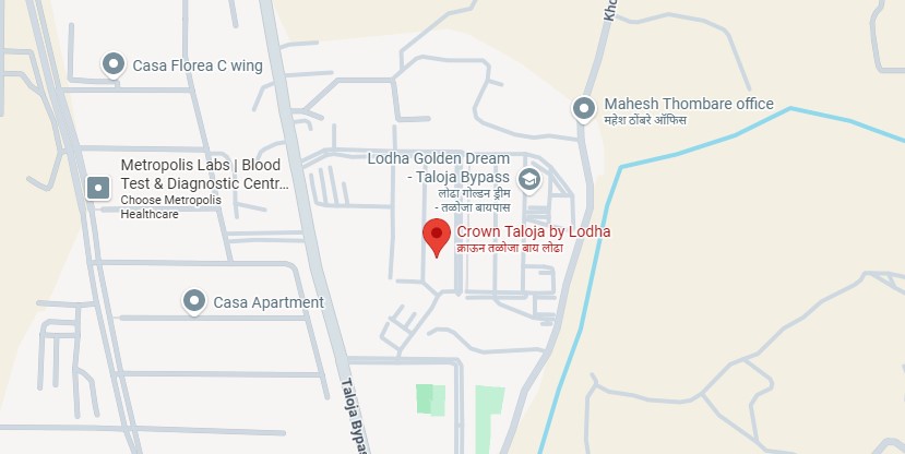Lodha Crown Taloja is strategically located in Taloja, Navi Mumbai, offering excellent connectivity to key areas like Panvel, Kharghar, and Mumbai via the Sion-Panvel Expressway and local railway network. The area is witnessing rapid infrastructure development, including upcoming metro and road projects, which enhance commuting convenience. Residents benefit from nearby educational institutions, hospitals, shopping centers, and daily essentials, making it ideal for families and professionals. Surrounded by a growing township environment, the location offers a balanced mix of urban amenities, greenery, and investment potential.