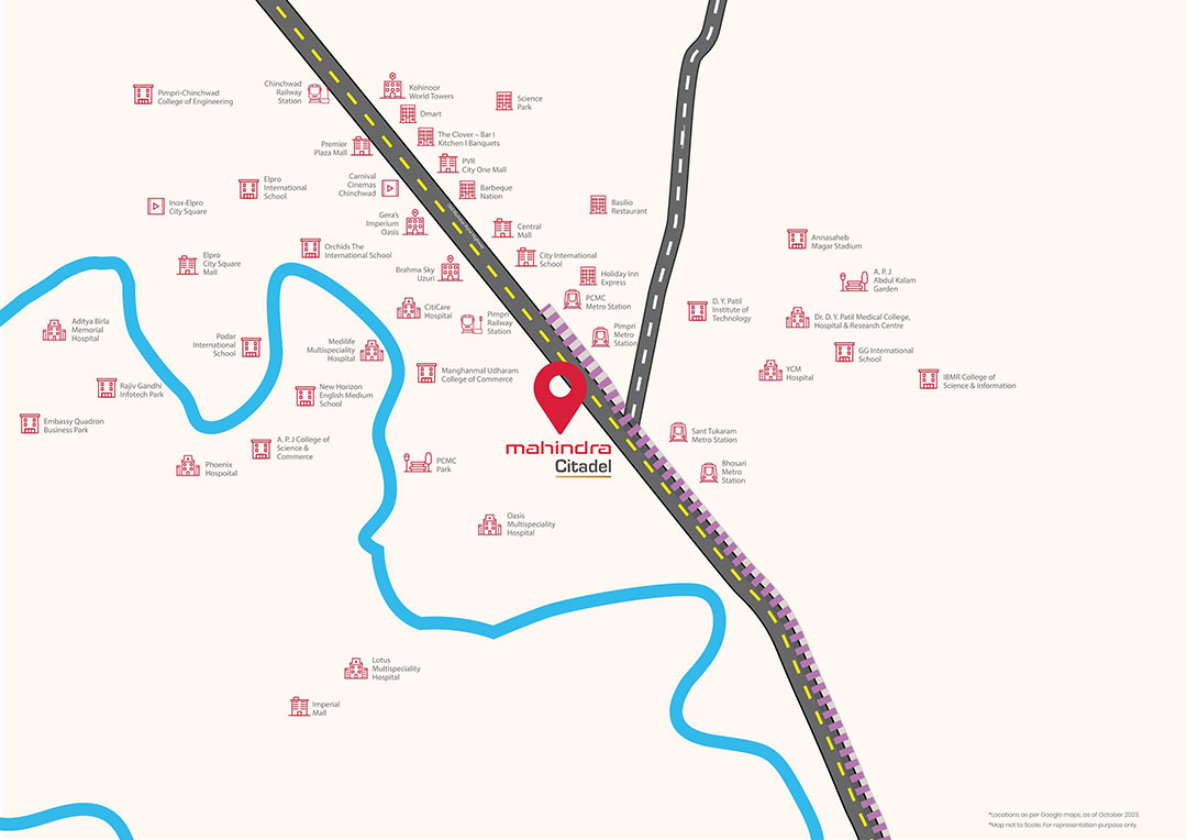 Mahindra Citadel enjoys a strategic location in Pimpri, one of Pune’s most well-developed and connected areas. The project offers seamless connectivity to major employment hubs like Hinjewadi IT Park, Chakan Industrial Belt, and Talegaon MIDC, making it ideal for professionals. It is well-linked through major roads such as the Old Mumbai–Pune Highway (NH-48) and the Pune–Mumbai Expressway, ensuring easy access to both Pune city and Mumbai.
