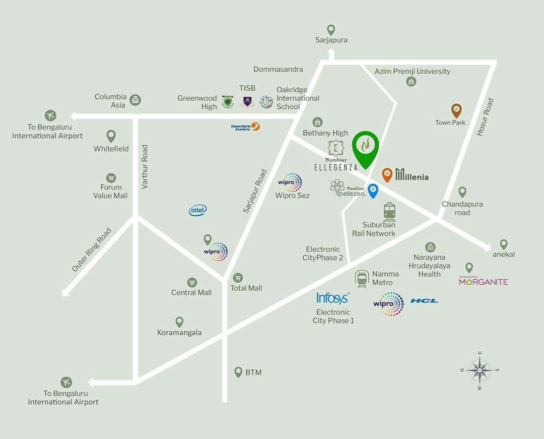 Nambiar Ellegenza is strategically located in Bengaluru, offering residents excellent connectivity and convenience. The project is well-linked to key areas of the city through major roads, ensuring smooth commutes. It is close to prominent IT hubs and business centers, making it an attractive choice for working professionals. Reputed schools, colleges, and educational institutions are situated nearby, catering to quality learning needs. The location also provides easy access to top healthcare facilities, ensuring reliable medical care. Additionally, shopping malls, supermarkets, restaurants, and leisure destinations are all within close reach. Despite its connectivity, the project is nestled in a serene environment, offering a calm and green residential atmosphere.