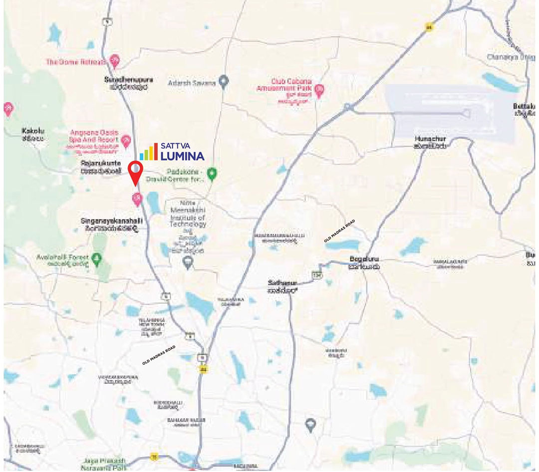 Sattva Lumina is strategically located in a well-connected area of Bengaluru, providing residents with easy access to major roads and highways for smooth commuting. The project is close to key IT hubs and business centers, making it convenient for professionals. Renowned schools and colleges in the vicinity ensure quality education, while nearby hospitals and healthcare facilities provide reliable medical support. Shopping malls, supermarkets, restaurants, and entertainment options are all within easy reach. Despite its urban connectivity, the project is set amidst serene and green surroundings, offering a peaceful and refreshing living environment.