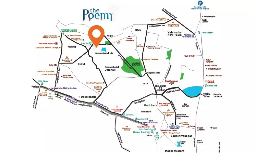 Shriram The Poem is strategically located in a well-connected area of Bengaluru, offering easy access to major roads and highways for smooth commuting. The project is close to prominent IT hubs and business centers, making it convenient for working professionals. Reputed schools and colleges in the vicinity ensure quality education, while nearby hospitals and healthcare facilities provide reliable medical support. Residents also benefit from proximity to shopping malls, supermarkets, restaurants, and entertainment options. Despite its urban connectivity, the project is set amidst green and serene surroundings, offering a peaceful and refreshing living environment.