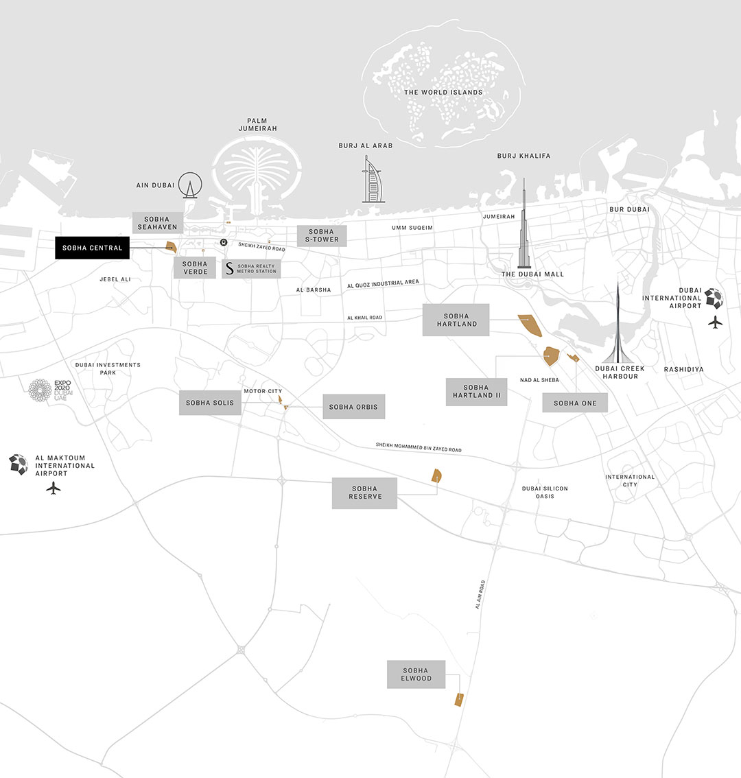 Sobha Central enjoys a prime location on Sheikh Zayed Road, one of Dubai’s most prominent highways, offering seamless connectivity to key business districts, commercial hubs, and major landmarks. It is strategically positioned near Jumeirah Lake Towers (JLT) and within easy reach of Downtown Dubai and Business Bay, ensuring quick access to shopping, dining, and entertainment options. The location provides excellent connectivity to Dubai International Airport and other emirates, making commuting effortless. Its central position also allows residents and investors to benefit from the city’s vibrant urban lifestyle while maintaining proximity to essential services and transport infrastructure.
