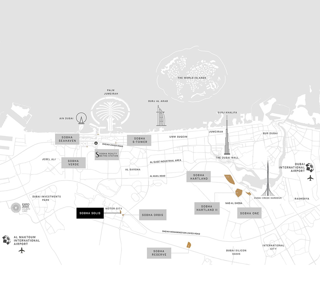 Sobha Solis is strategically located in Motor City, Dubai, offering excellent connectivity to major roads such as Al Qudra Road and Hessa Street, allowing easy access to key areas of the city. The development is close to prominent landmarks including the Dubai Autodrome, Miracle Garden, and various shopping, dining, and entertainment destinations. Its location provides a balanced lifestyle, combining the tranquility of a well-planned community with the convenience of being near Dubai’s business, leisure, and recreational hubs.