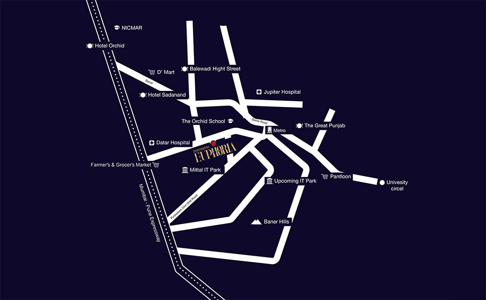 Sukhwani Euphoria is strategically located in Baner, Pune, offering excellent connectivity to major areas, IT hubs, and the Mumbai–Pune Highway. The neighbourhood provides easy access to reputed schools, hospitals, shopping centres, and daily conveniences, ensuring a convenient and well-rounded lifestyle for residents. Well-developed roads and public transport options enhance accessibility, while proximity to entertainment, dining, and recreational hubs adds to the appeal. With an established and growing residential community, the location makes Sukhwani Euphoria an attractive choice for comfortable living and long-term investment.