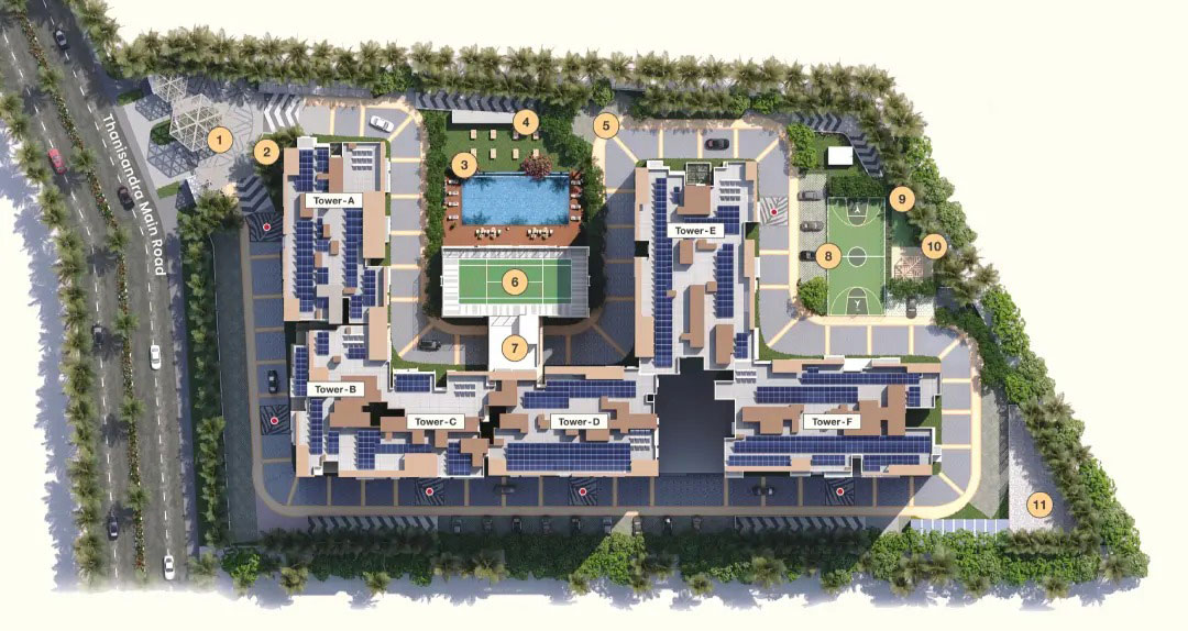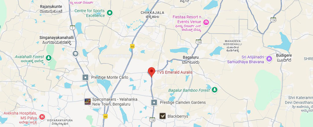 TVS Emerald Auralis is strategically located in North Bangalore, offering excellent connectivity to major IT hubs, Kempegowda International Airport, and key areas such as Hebbal and Yelahanka. The project is surrounded by reputed schools, hospitals, shopping centres, and entertainment options, ensuring that daily necessities and lifestyle needs are easily accessible. With upcoming infrastructure developments, expanding road networks, and a peaceful residential environment, the location combines convenience, growth potential, and a serene setting, making it ideal for families seeking a balanced urban lifestyle.